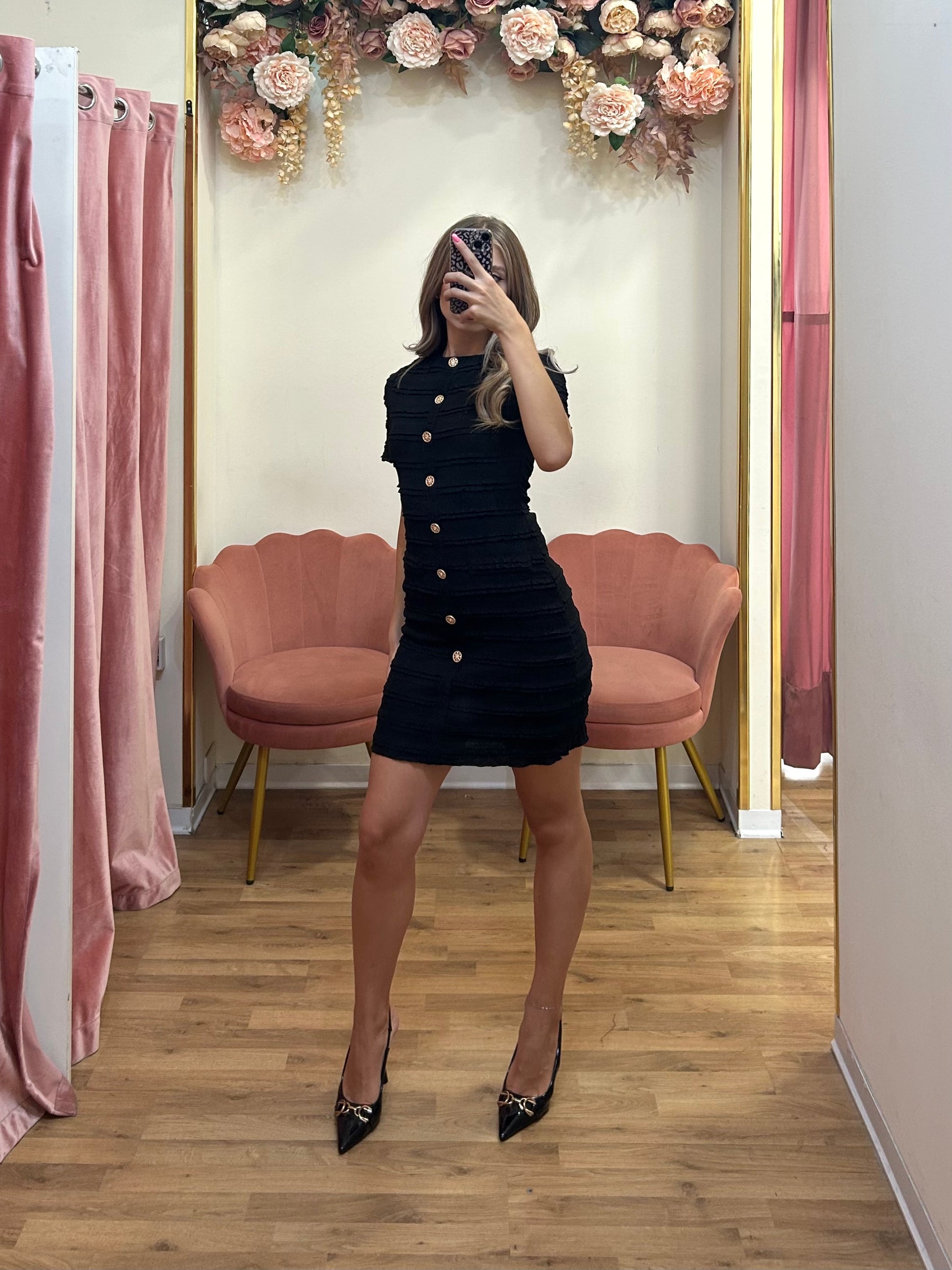 Un abito elegante con tessuto elasticizzato e maniche corte. Il design presenta dettagli di bottoni oro, aggiungendo un tocco di lusso al tuo outfit. Comodo e alla moda, perfetto per un evento formale.