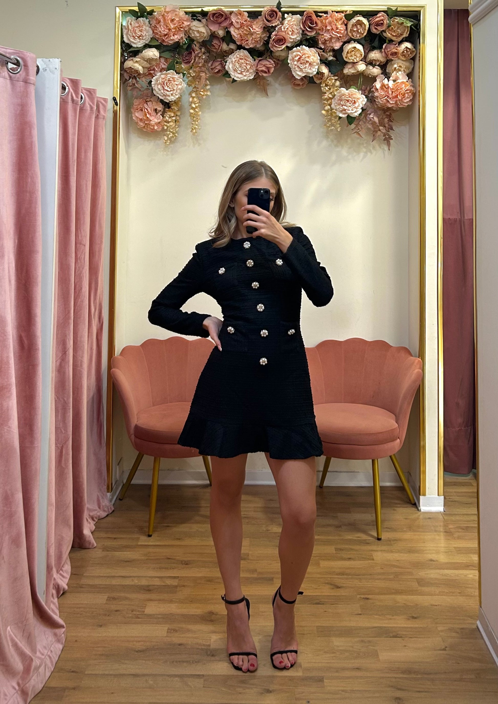 Abito corto in tessuto tweed. Modello sfiancato con maniche lunghe e scollo rotondo. Applicazione di bottoni gioiello effetto perla sul davanti. Balza sul fondo. Chiusura posteriore con zip invisibile. Raffinato ed elegante, questo abito corto Γ¨ la scelta perfetta per chi ama uno stile sofisticato e senza tempo.