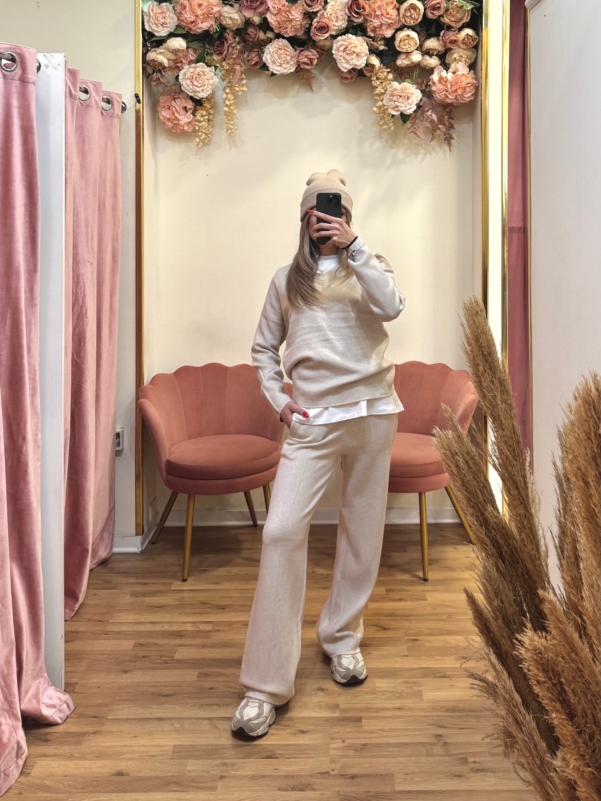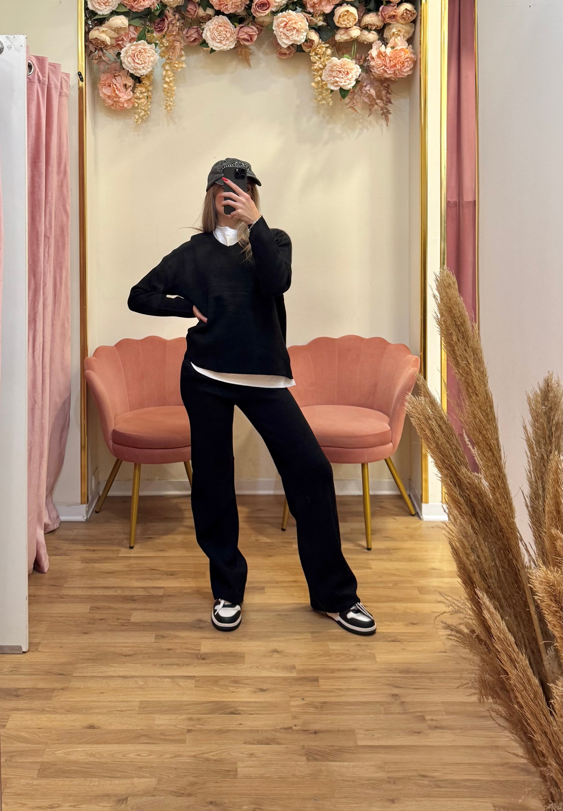 Questo elegante coordinato con pantalone a gamba larga e maglia oversize con scollo a V è perfetto per un look chic e confortevole. Realizzato con tessuti morbidi, offre una vestibilità comoda e una silhouette elegante. Ideale per essere indossato in qualsiasi occasione, da una giornata al lavoro a una serata fuori con gli amici. Assicura un outfit alla moda e versatile per ogni donna di stile.