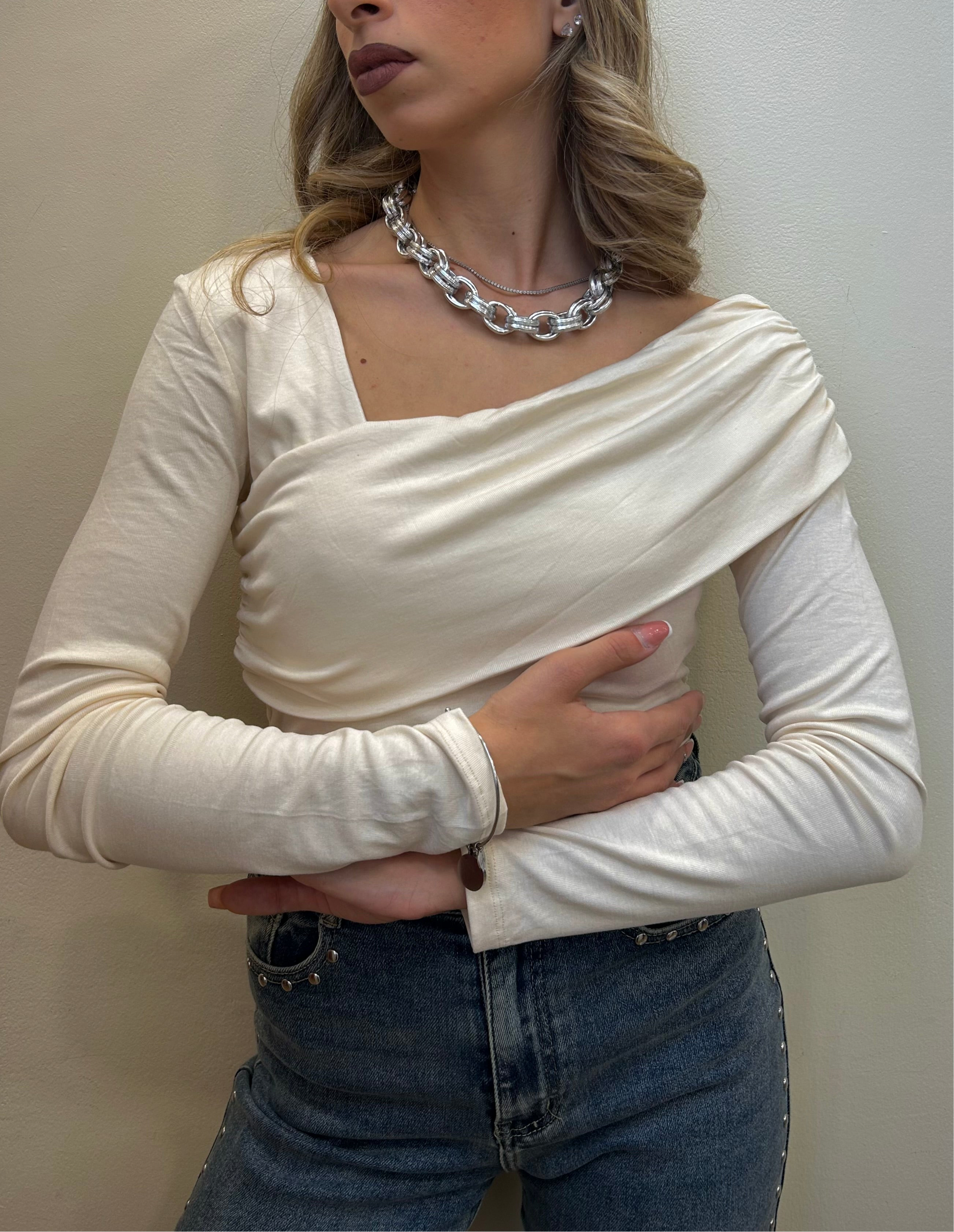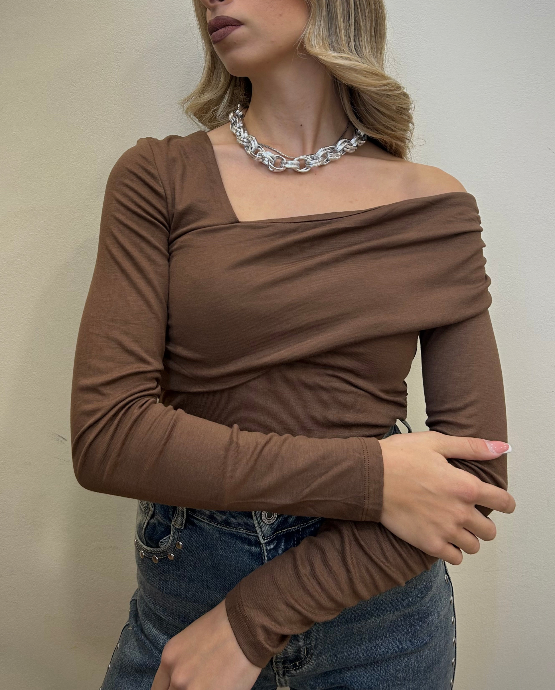 Questa maglia Shery presenta un collo particolare che aggiunge un tocco di eleganza al tuo outfit. Realizzata con materiali di alta qualità, garantisce comfort e stile. Rinnova il tuo guardaroba con questa maglia dalla vestibilità perfetta e dal design unico.