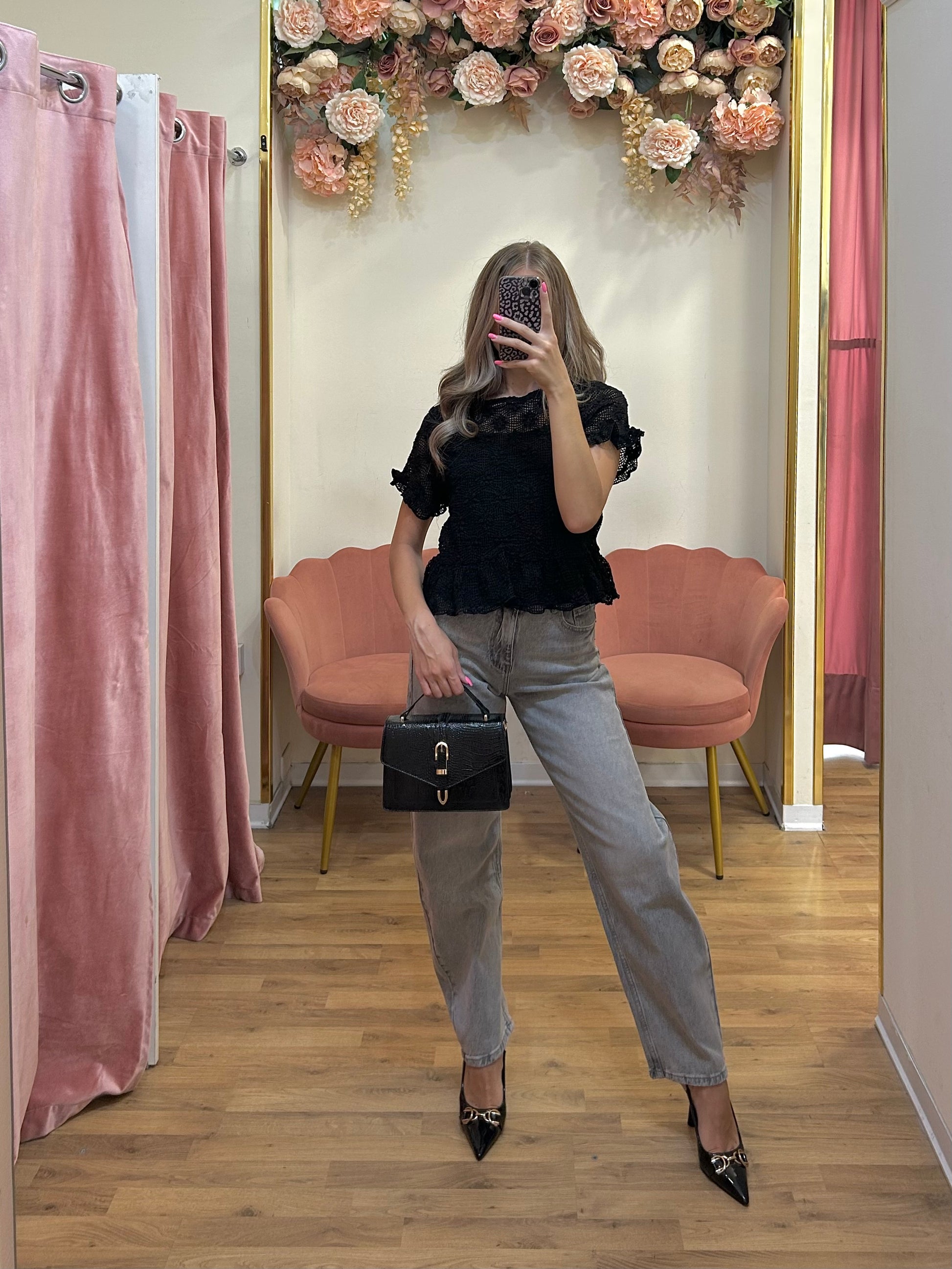 Questa maglia sorprendente presenta un ricamo particolare e una lavorazione traforata che la rendono unica e di classe. La vestibilità stretta valorizza la figura, mentre i dettagli arricciati sulle maniche e in vita aggiungono un tocco di eleganza. Indossala per un look sofisticato e delicato.