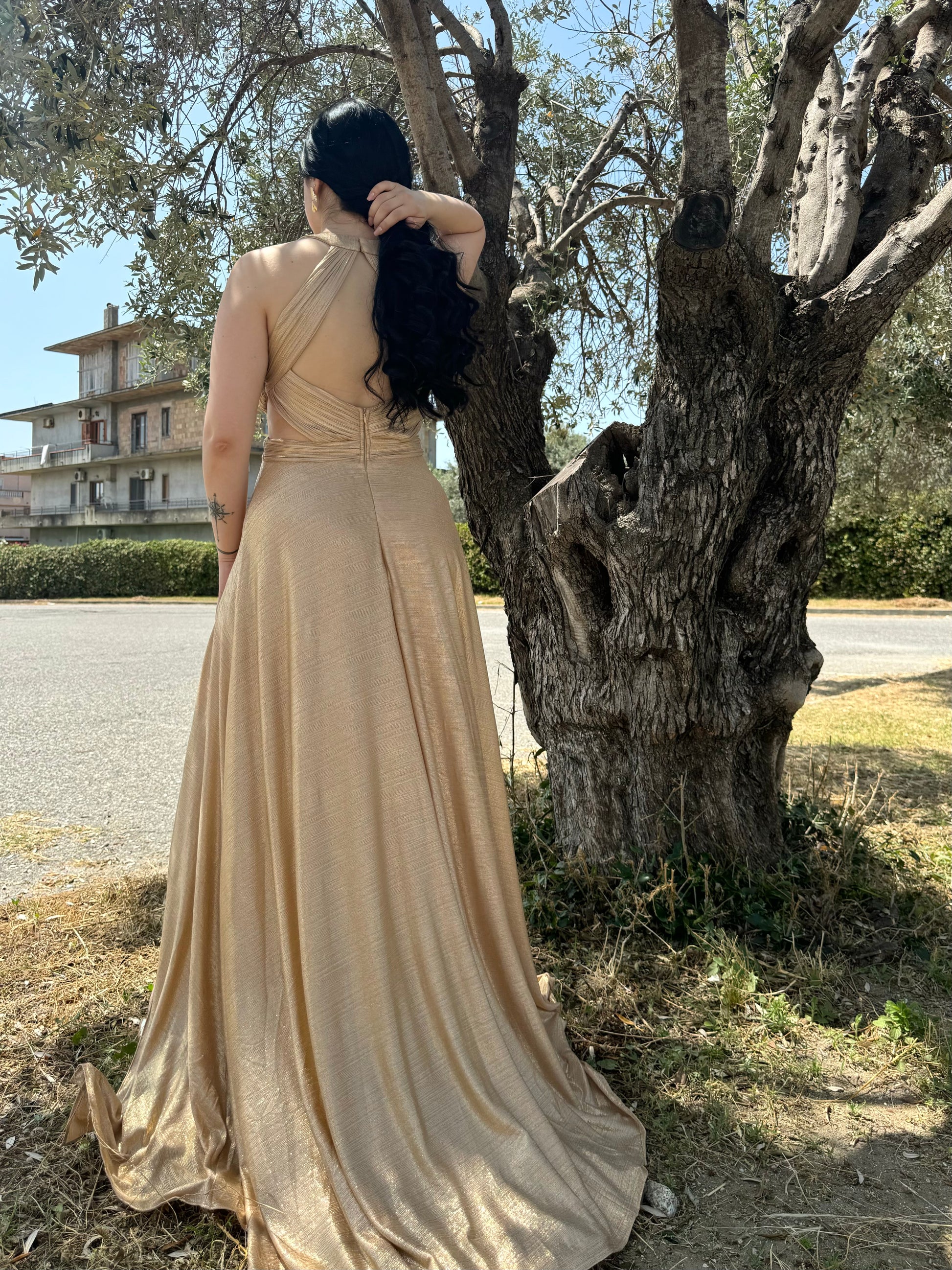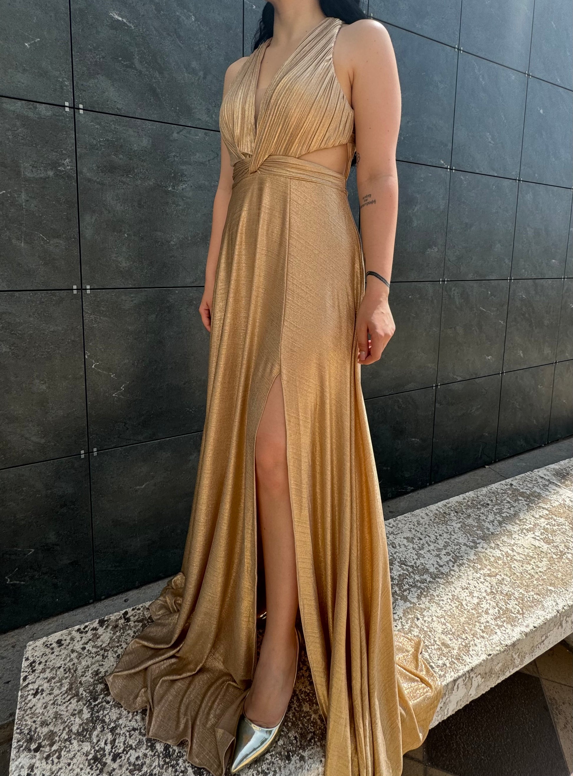 Lasciati conquistare da questo abito lungo in tessuto laminato dorato: un mix perfetto di eleganza e sensualità. Il profondo scollo a V e il nodo centrale valorizzano il décolleté, mentre lo spacco laterale aggiunge un tocco audace e raffinato. Ideale per cerimonie, eventi serali o occasioni in cui vuoi semplicemente brillare.